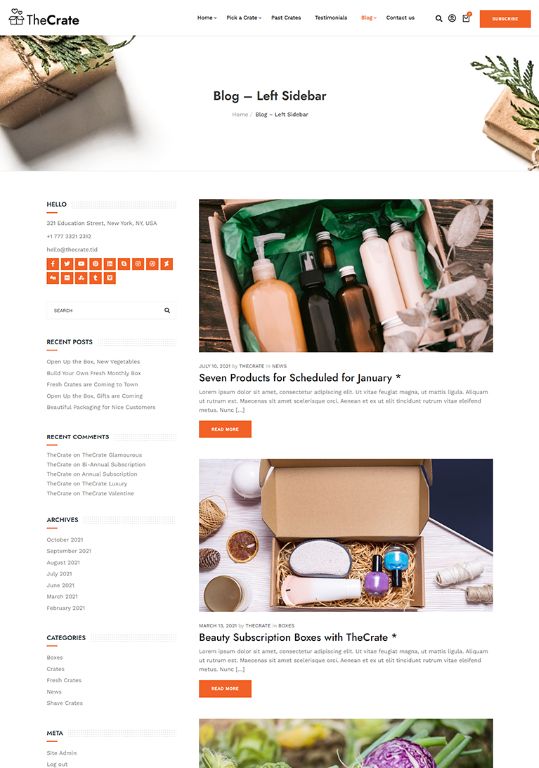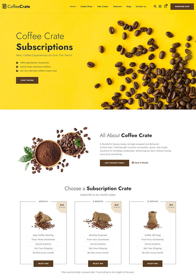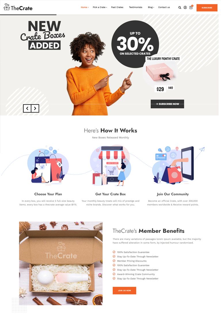 The Perfect Subscription Box ThemeNew Subscription Box Demos Added Weekly Fast & Easy to Use, Extensive Documentation Perfect for Subscription Box Model SitesView DemosPurchase ThemeSubscription Box Premade DemosDifferent Subscription Box Model Premade SitesShave CratesBeauty CratesFresh Food CratesCoffee CratesMeal Kits CratesSubscription Box Inner PagesAll You Need To Start A Subscription Box Model ShopShopSubscription ProductBlog - Left SidebarBlog - No SidebarBlog - Right SidebarBlog ArticleStart Using TheCrate Today!Creating a subscription box shop has never been this easy PURCHASE